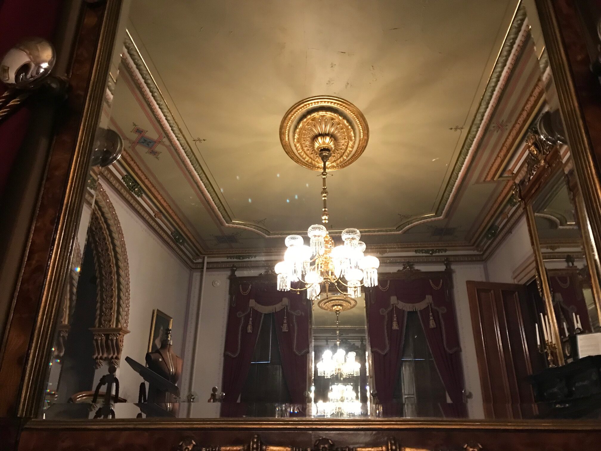 “When the Fenton Mansion was built in 1863 (-1864), gas was employed to light the gasolier in this room. Over the course of time, (some of) the delicate shades and crystal prisms were broken or removed. After Elizabeth Fenton’s death in 1901, the building sat empty for several years, then it was purchased by the city and the gasolier was crudely electrified.