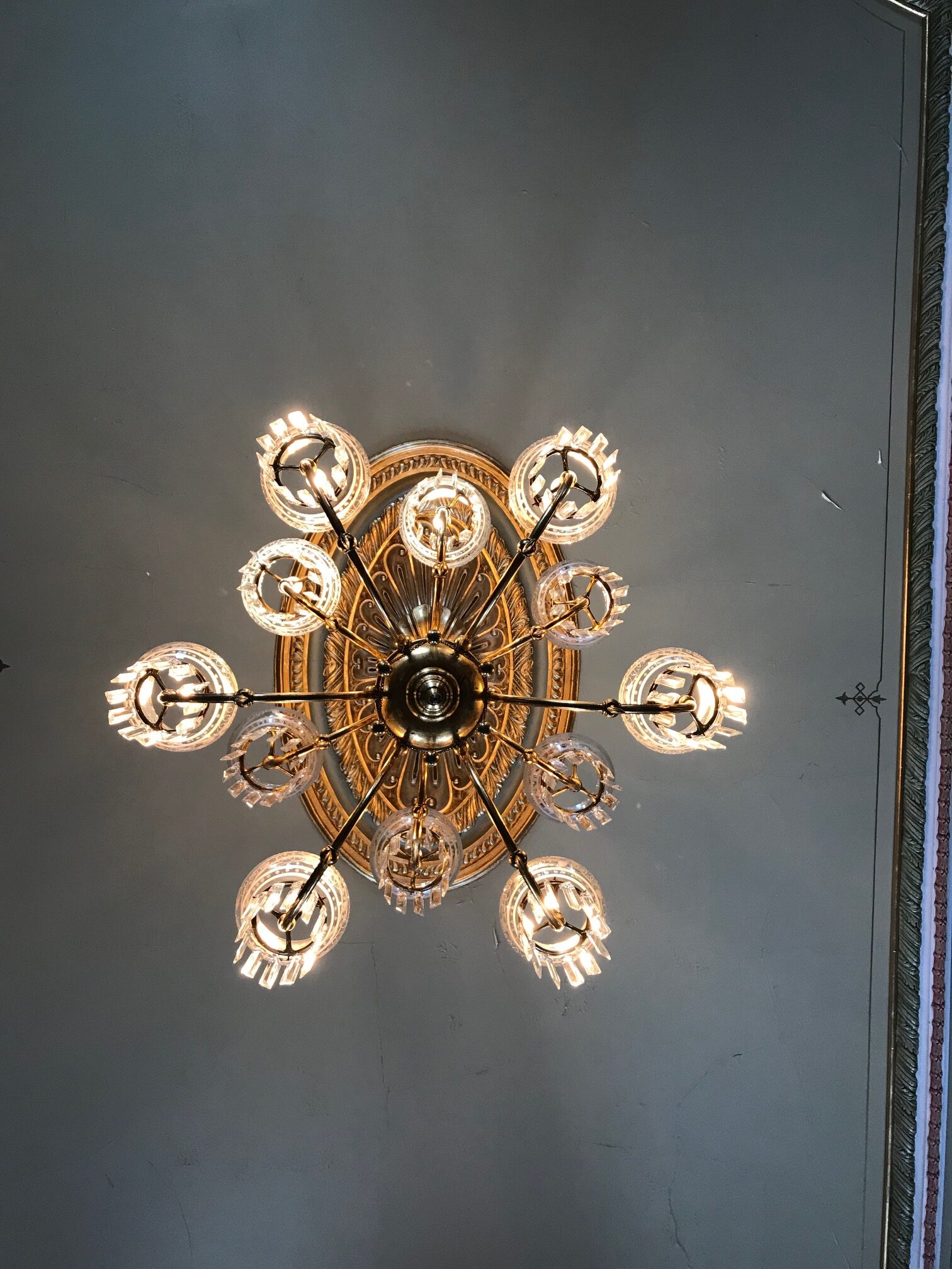 The gasolier was sent to David Jenks, antique lighting conservator in Syracuse, NY. He attributed the 1875 neo-classically designed, 12 branch, gold plated brass fixture to Mitchell, Vance, and Company, 597 Broadway, NYC. This company was one of the foremost lighting manufacturers for that time. The conservator selectively cleaned the gold-plated brass fixture and cast missing decorative balls. It was then completely rewired in a way that resembles gas fittings. Appropriate shade rings and a set of twelve etched antique shades were found and attached. The 144 crystal prisms are old stock imported from Czechoslovakia.