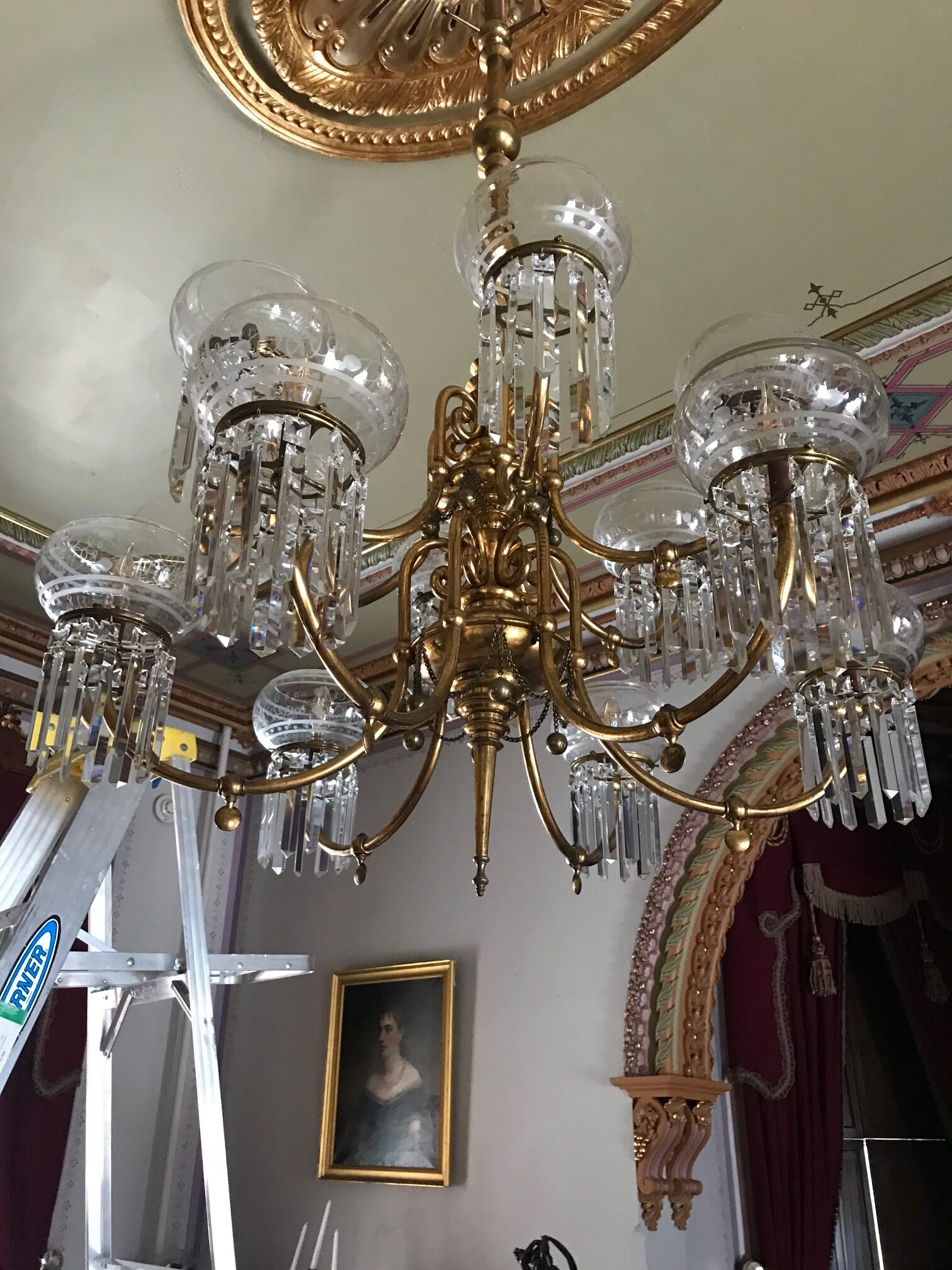 I recently told Wendy that when I get off the ladder for the last time, I take a deep breath and realize I must have been holding my breath a lot. I did, however, fail to thank her for her painstaking attention to detail as she worked out the restoration of the gasolier, the shipping to and from Syracuse, most likely worrying about it until it returned, and all the other Drawing Room details. Thanks to Wendy, Director Candace Larson, Textile Curator Phoebe Forbes, many volunteer workers, and the Sheldon Foundation, the Fenton Drawing Room is still a sight to be seen and loved.