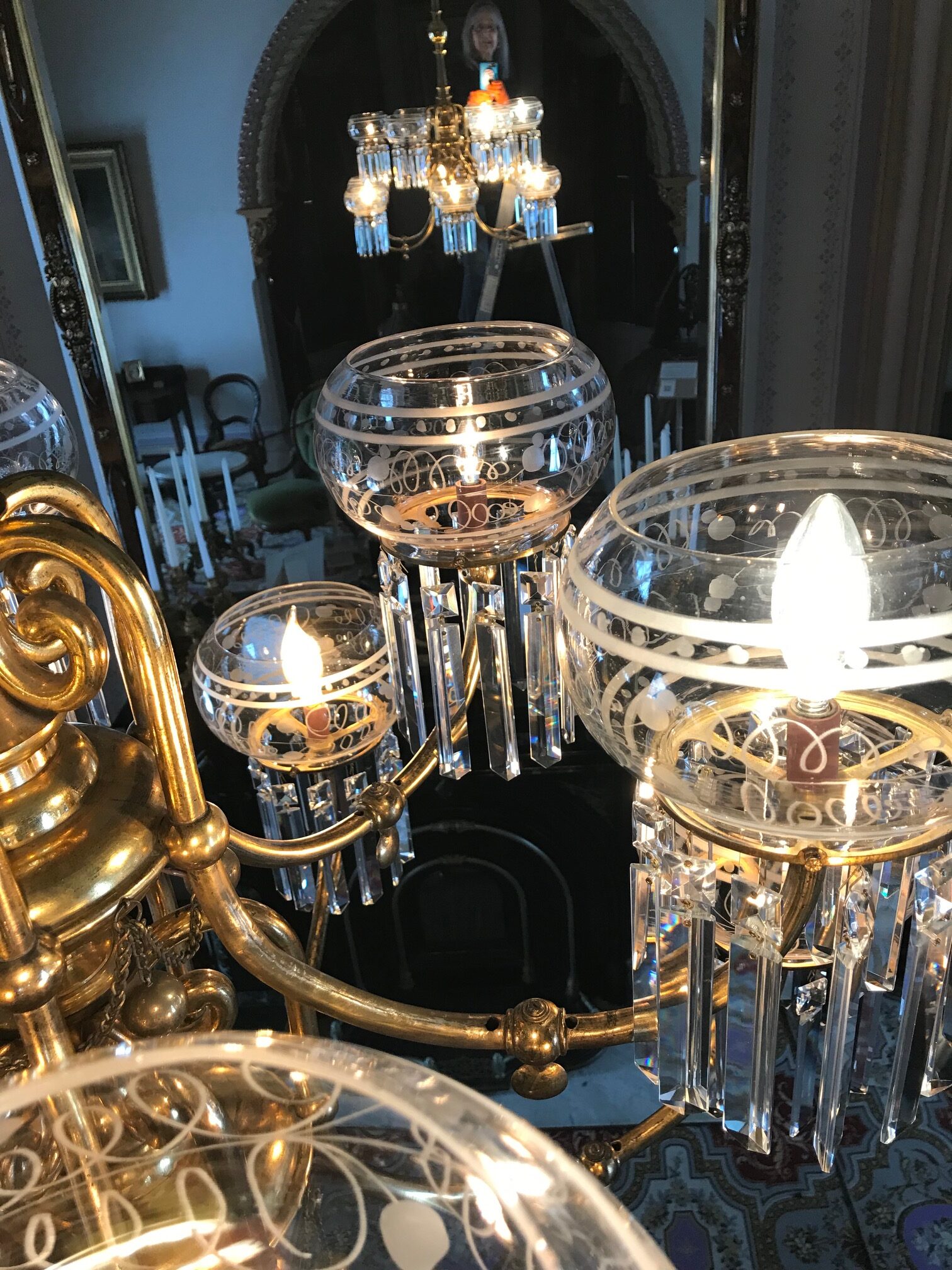 I’m sure the Fenton family cleaning staff had their own issues with the delicacy and stress of not wanting to be the one who broke any part of the gasolier. So, I feel like I’m in good company as I carefully use one damp microfiber cloth in my left hand and a dry microfiber cloth in my right hand and individually clean a year’s worth of dust and film from the fixture, shades, and each of the crystal prisms.